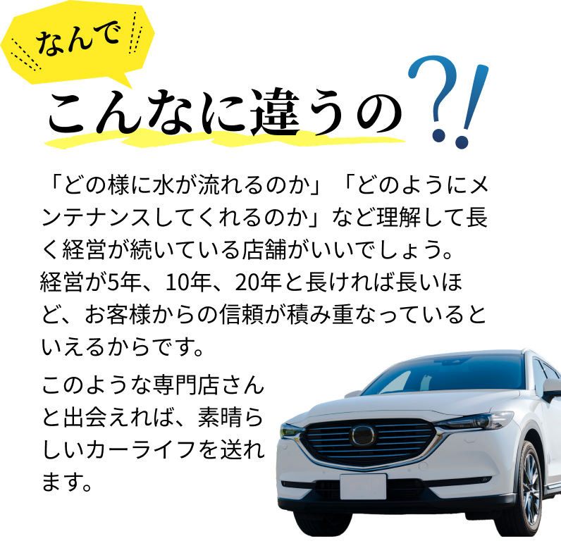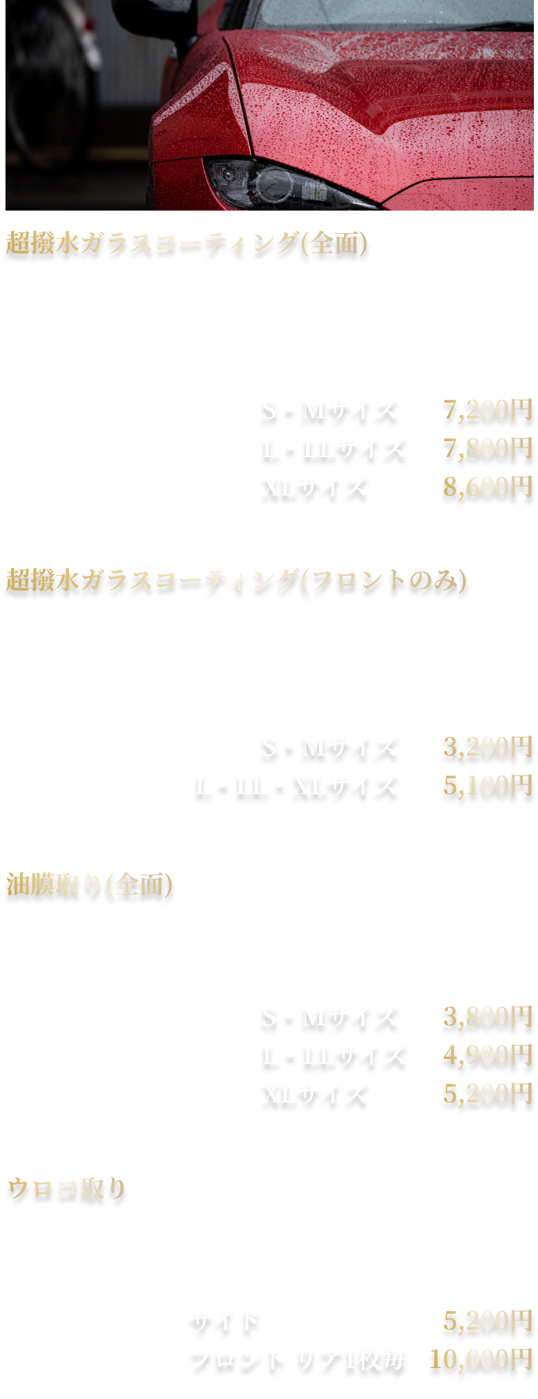 - ご安心ください。 ワックスや撥水コートが塗られると、表面はそのコーティングの性質を持つようになります。多くの場合、汚れやすくなり、艶が失われることがありますが、時間が経てば自然に落ちることもありますので、大きな心配は不要です。ただし、しつこく残るワックスもあるため、そのような場合には再施工をおすすめします。